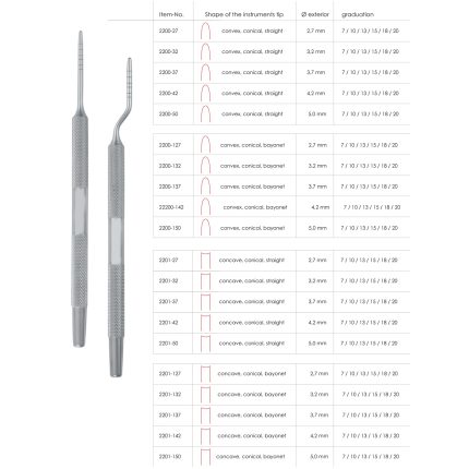 Implantology Osteotomes Item-No. Shape of the instruments tip Ø exterior graduation 2200-27 convex, conical, straight 2,7 mm 7 / 10