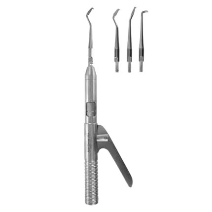 With the crown spreader it is possible to spread off crowns without rotationon the root underneath, in order to protect the nerve. The crown is getting slotted with a burr. Insert the plier into the slit, according to its position from occlusal, buccal or lingual. The crown is getting spreaded securely and anatomically correct by compressing the plier. The advantages of the instrument are: there is no rotation on the root or pressure on neighbor teeth. ;